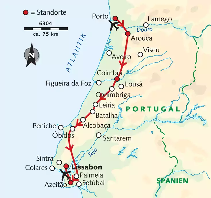 Wir übernachten an fünf verschiedenen Standorten. In Porto, während der ersten zwei Nächte, beherbergt uns das zentral, aber ruhig gelegene Casual Hotel Inca (4*, 62 Zimmer). Danach wohnen wir dreimal in Arouca im kleinen Hotel Rural Quinta de Novais (3*) mit nur 16 gemütlichen Zimmern. Weiter geht es nach Coimbra. Unser Vier-Sterne-Hotel Vila Galé Coimbra liegt am Mondego Fluss. In Azeitão nächtigen wir dreimal im Hotel Rural Club d´Azeitão (4*, 46 Zimmer) am Fuße der Arriba Berge. Die letzten beiden Übernachtungen finden im Hotel Lisboa (4*, 60 Zimmer) in Lissabon statt. Es liegt nur wenige Gehminuten vom historischen Zentrum entfernt.