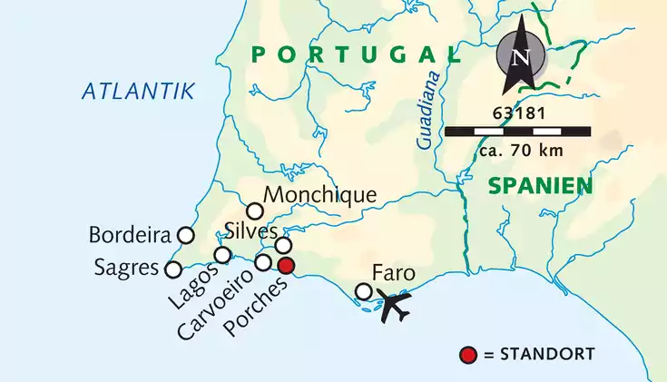 Du möchtest die sogenannte „Felsalgarve" gemeinsam mit gleichgesinnten Reisepartnern erwandern? Dann erwarten dich sowohl pittoreske, gelb leuchtende Felswände mit Nischen und Grotten als auch feinsandige Strände und abgelegene Buchten mit smaragdgrünem Wasser. Gemeinsam mit deinen Mitreisenden lernst du außerdem das Landesinnere, ein Hügelland, das in der Serra de Monchique bis zu 900 m Höhe erreicht, kennen. Direkt vom Hotel aus kannst du mehrere Sandstrände fußläufig erreichen – Algarve pur!