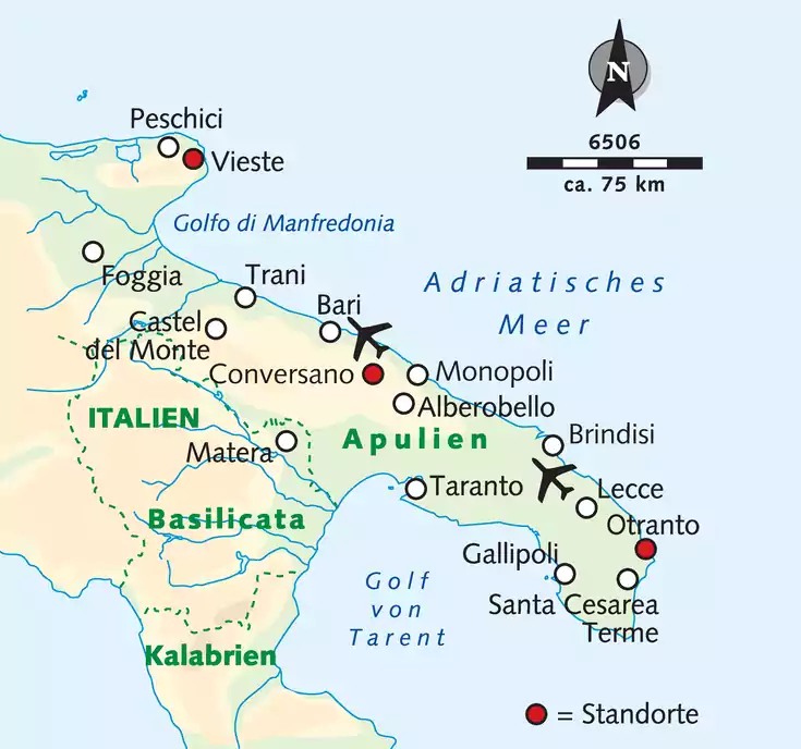 Die ersten vier Nächte wohnen wir im Süden im eleganten Hotel Vittoria Resort mit Pool und Wellnessanlage, 5 Gehminuten vom Strand und 300 m von der Altstadt von Otranto entfernt. Die Zimmer verfügen über Klimaanlage/Heizung, Sat-TV, Minibar, Telefon und Föhn. Für die nächsten fünf Übernachtungen fahren wir gen Norden nach Vieste, ein malerisches Städtchen direkt am Meer. Unsere Hotelanlage degli Aranci liegt ca. 200 m vom Strand entfernt, besitzt einen Pool mit Liegestühlen und schöne Zimmer mit Balkon, Sat-TV, Telefon, Minibar und Föhn. Die letzten 5 Nächte verbringen wir in Conversano im Hotel Corte Altavilla. Das Hotel ist mitten in der Altstadt gelegen und verfügt über eine Dachterrasse mit herrlicher Aussicht über die Stadt. Der Wellnessbereich (teilweise gegen Gebühr) in den historischen Kellerräumen verspricht Entspannung nach unseren ereignisreichen Tagen. Die Zimmer sind ausgestattet mit Klimaanlage/Heizung, Sat-TV, Minibar, Telefon und Föhn. Alle Hotels haben WLAN und gehören zur Vier-Sterne-Kategorie. Die Swimmingpools sind frühestens ab Mai geöffnet und können Anfang Oktober bereits wieder geschlossen sein.