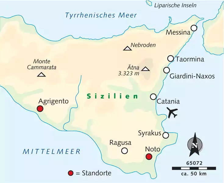 Flug nach Catania und Transfer zum Hotel (ca. 1 1/2 Std., 4 Ü in Noto).
