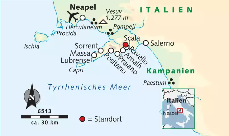 Hotel: Wir wohnen im familiengeführten Drei-Sterne-Hotel La Margherita, ruhig am Rande von Scala oberhalb der Amalfiküste gelegen. Zu dem Hotel gehört auch die Villa Giuseppina, ca. 200 m entfernt, in der wir den Swimmingpool und die Sonnenterrasse kostenlos nutzen können. Das Hotel La Margherita verfügt über einen Frühstücksraum und eine kleine Bar, die Villa Giuseppina zusätzlich über ein Restaurant, in dem wir zu Abend essen. Zimmer: Die klimatisierten Zimmer verfügen über einen Balkon oder Terrasse mit Panoramablick. Zur Zimmerausstattung gehören ein TV sowie ein Badezimmer mit Dusche/WC und Föhn. Verpflegung: Frühstück und 3-Gang-Menü am Abend (in der Villa Guiseppina, ca. 200 m entfernt) Lage: Das kleine Dorf Scala liegt in einer Panoramalage sehr ruhig oberhalb der Amalfiküste. Die Lage erlaubt einen erholsamen Urlaub nur wenige Fahrminuten von den touristischen Ortschaften entfernt: So wird Ravello nach einer 5-minütigen, Amalfi nach einer 15-minütigen Autofahrt erreicht. Die nächsten Wanderwege beginnen gleich vor dem Hoteleingang.