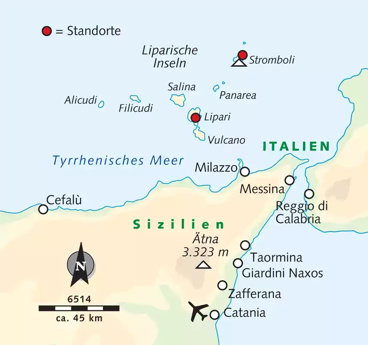 Ankunft in Catania. Bei Landung in Catania der gesamten Gruppe bis spätestens um 15 Uhr, erfolgt noch heute die Überfahrt von Milazzo nach Lipari. Bei späterer Ankunft in Catania (auch wenn es nur einzelne Gäste betrifft) benötigen wir eine Zwischenübernachtung auf Sizilien, bevor es am zweiten Tag weiter nach Lipari geht.