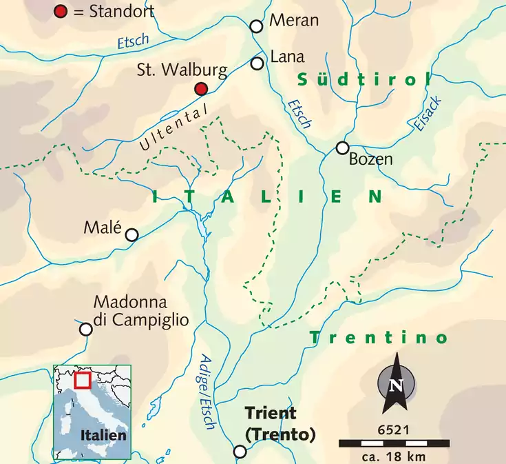 Hotel: Unser kleines, traditionelles Genießerhotel Alpenhof der Drei-Sterne-Superior-Kategorie verfügt neben 25 Zimmern über ein Restaurant, eine finnische Sauna, eine Infrarot-Kabine, ein Dampfbad und ein Kneippbecken. Für die freien Tage stehen uns Mountainbikes kostenlos zur Verfügung, Whirlpool gegen Gebühr. Zimmer: Die frisch renovierten Zimmer verfügen über Sat-TV, Telefon, WLAN, Safe, Föhn, Balkon und Heizung. Die Einzelzimmer sind Doppelzimmer zur Alleinbenutzung. Verpflegung: Frühstück und ein 5-gängiges Abendessen (auch mit vegetarischer Variante) Lage: Das Ultental ist ein kleines Seitental des Etschtales mit nur wenigen Dörfern, ca. 40 km lang und von zahlreichen Gipfeln über 2.500 m flankiert. Die gute Ausgangslage des auf 1.200 m gelegenen Hauptortes St. Walburg ermöglicht uns die Wanderregion mit kurzen Transfers oder direktem Einstieg am Hotel zu erkunden. Das Hotel befindet sich im Ort St. Walburg in ruhiger Hanglage.