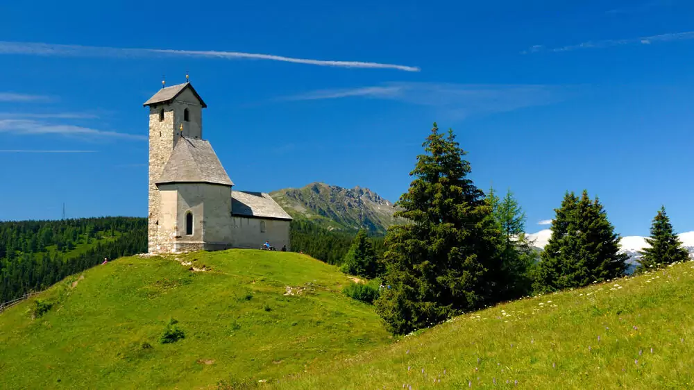 Transfer Richtung Proveis. Von der Passstraße aus steigen wir zur Gampenalm auf und wandern dann hinüber zur Spitzenalm. Auf der Hüttenterrasse genießen wir einen schönen Blick auf die Ultner Berge – wie wär’s mit einer Südtiroler Marende? Danach Abstieg nach St. Walburg (GZ: 4 1/2 Std., + 300 m, - 850 m).
