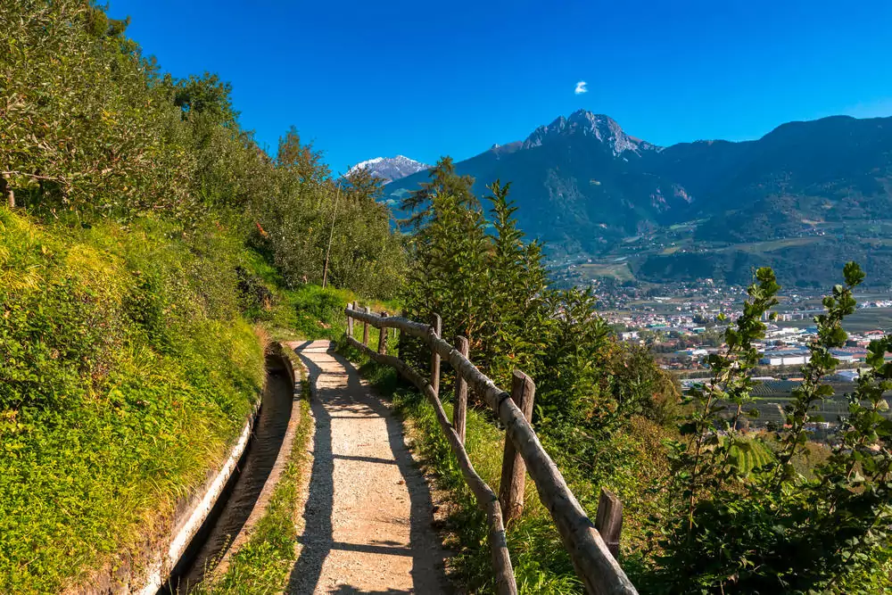 Mit dem öffentlichen Bus fahren wir nach Lana. Wir wandern auf dem oberhalb von den Ortschaften angelegten Marlinger Waalweg, der uns schöne Ausblicke in den Meraner Talkessel gewährt. Kulinarisch hat diese Wanderung auch einiges zu bieten: Es warten einige urige Einkehrmöglichkeiten auf uns (GZ: 3 Std., + 50 m, - 250 m).