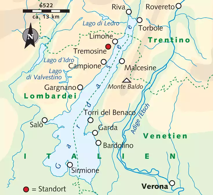 Italiens größter See, der Lago di Garda, ist einer der meistbesuchten Alpenseen. Die Landschaft zwischen Hochgebirge und mediterraner Kulisse ist ideal für einen erholsamen Wanderurlaub. Liebliche Hügel im Süden gehen über in die alpinen Gebirgsketten im Norden. Typische Mittelmeer-Vegetation mit Zypressen, Oliven und Palmen werden in mittlerer Höhenlage von Laubwäldern und weiter oben von Nadelhölzern abgelöst. Von saftigen Almwiesen bieten sich wunderbare Panoramablicke über den langgestreckten See.