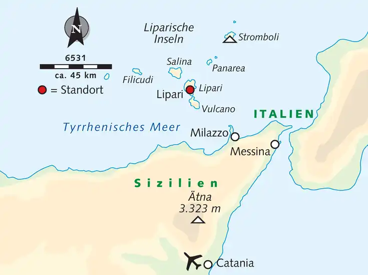 Je nach Flugzeiten können Zwischenübernachtungen am Anfang und Ende auf Sizilien (auch im Drei-Sterne-Haus ohne Meerblick möglich) für die gesamte Gruppe notwendig sein. Bei Landung in Catania der gesamten Gruppe bis spätestens um 15 Uhr, erfolgt noch heute die Überfahrt von Milazzo nach Lipari. Bei späterer Ankunft in Catania (auch wenn es nur einzelne Gäste betrifft) benötigen wir eine Zwischenübernachtung auf Sizilien, bevor es am zweiten Tag weiter nach Lipari geht.