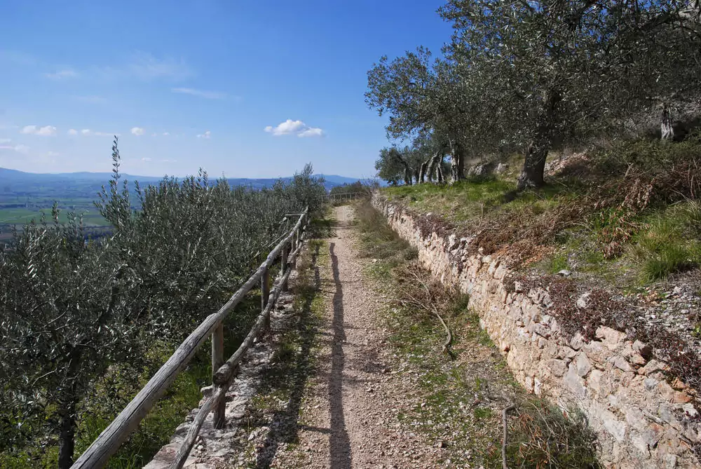 Direkt vom Hotel wandern wir zur anderen Seite des Tessino zu den Ruinen der östlichen Brückenfestung. Hier beginnt ein Pilgerpfad durch uralten Steineichenwald an den Hängen des Monteluco. Ziel ist das bereits 1218 gegründete und bis heute von Mönchen bewohnte Kloster Santuario di San Francesco. Der Spazierweg durch den heiligen Hain vermittelt mit der Eremitengrotte viel Atmosphäre und die Aussicht von einem Felsvorsprung ist überwältigend (GZ: 3 1/2 Std., +/- 500 m).