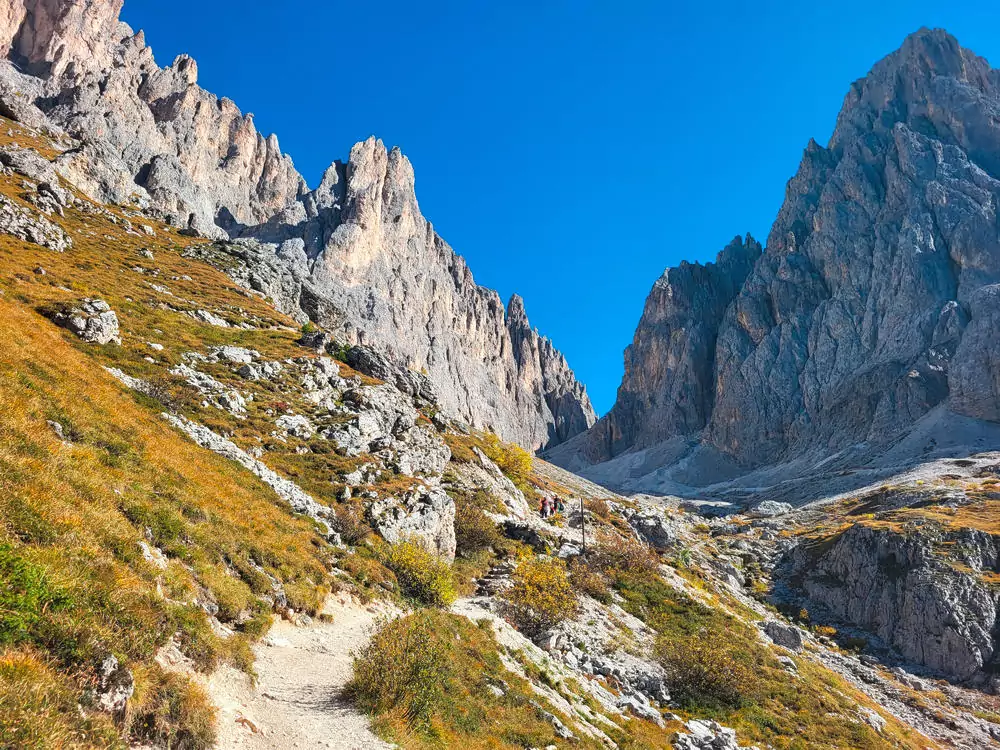 Die Sella besticht durch ihren hochalpinen Charakter, leichte Wege gibt es hier nicht. Heute wandern wir in Teilen über den Alta Via Dolomiti 2, der uns von Norden nach Süden über das Sella-Plateau führt. Immer wieder müssen wir an gesicherten Steigen die Hände zur Hilfe nehmen. Die Ausblicke sind atemberaubend und werden mit jedem gewonnenen Höhenmeter besser. Am Ende wartet am Sas Pordoi ein berauschendes Panorama auf uns (GZ: 6 1/2 Std., + 850 m, - 150 m).