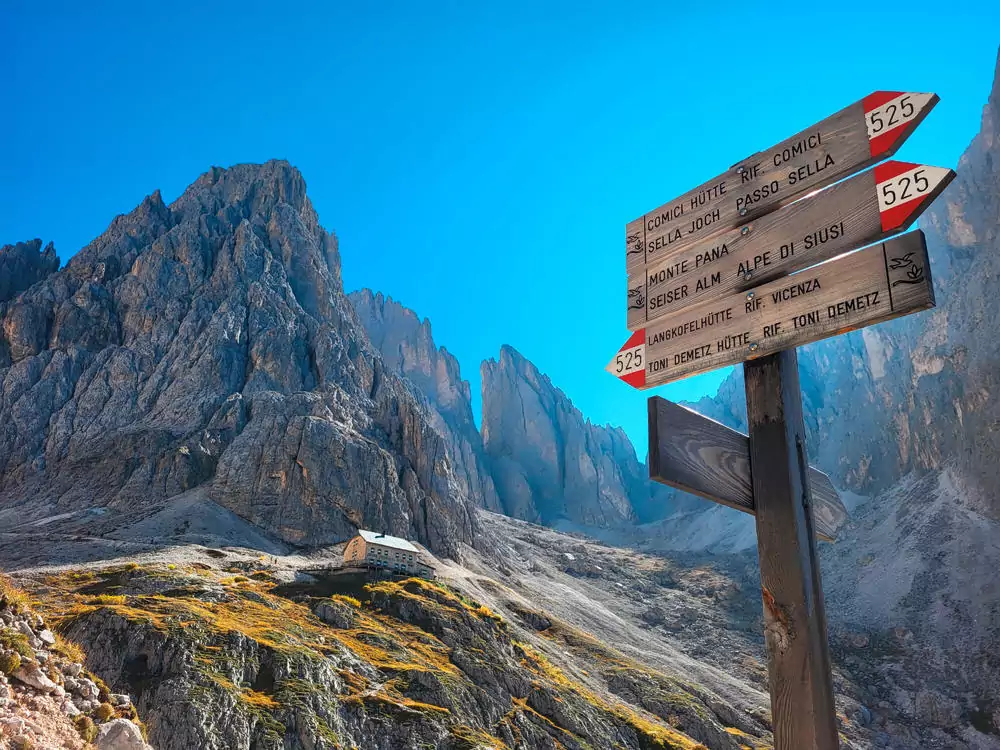 Von der Seilbahnstation Monte Pana und Mont de Seura (2.025 m) umrunden wir den Langkofel. Der Weg führt uns anfangs durch die sehr schroffe Langkofelscharte an einer der höchstgelegenen Hütten der Region vorbei, die Toni-Demetz-Hütte (2.685 m). Welch herrliche Aussicht wir hier auf die majestätischen Berge wie Marmorlada, Monte Civetta und Monte Pelmo genießen können! Am Sellajoch vorbei geht es wieder zurück zum Ausgangspunkt. Wer mag nutzt die grandiose Stehgondelabfahrt von der Demetzhütte zum Sellajoch-Haus und spart sich so 500 Höhenmeter bergab (GZ: 5 Std., +/- 800 m).