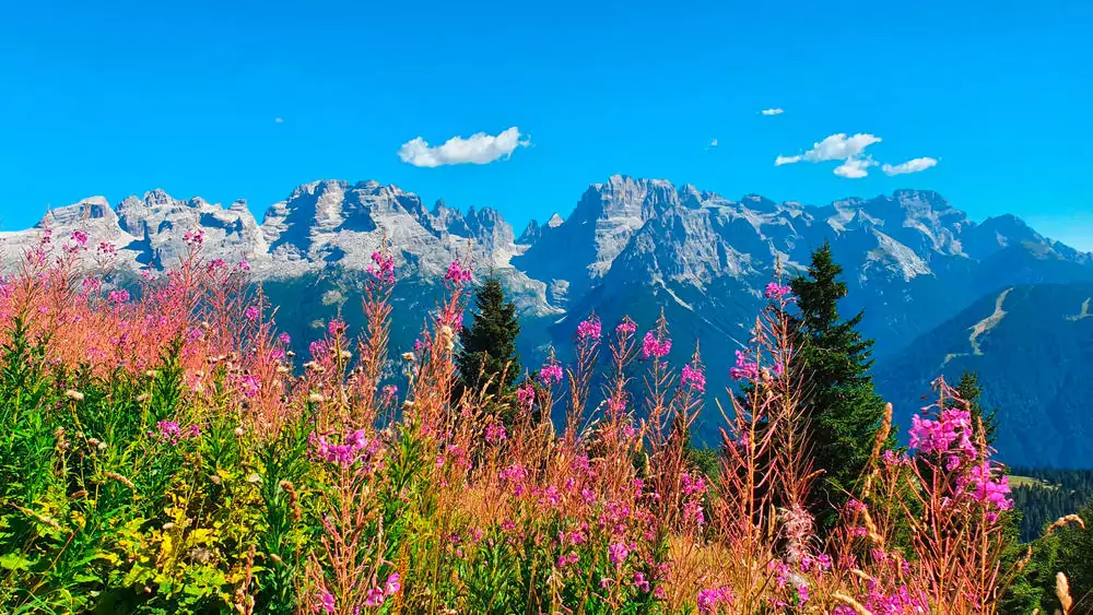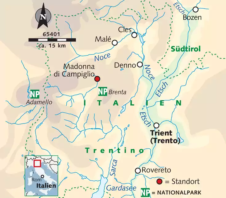Das Dolomitgestein hat nördlich des Gardasees zackige Gipfel, bizarre Türme und filigrane Felsnadeln in den sogenannten Brenta-Dolomiten entstehen lassen. Zahllose Pfade, Hütten und Almwege erschließen die landschaftlich einmalige Hochgebirgswelt dieses Gebirgsmassivs. Mittendrin liegt das berühmte Madonna di Campiglio, ein idealer Ausgangspunkt für unsere einfachen und moderaten Wanderungen, befinden wir uns hier doch schon in einer Höhe von über 1.500 m. Darüber hinaus erschließen viele Lift- und Seilbahnanlagen direkt vom Ort aus die höheren Panoramalagen – Natur pur! Kultur pur bietet uns ein Ausflug ins wunderschöne Trient. So vielfältig sind die Brenta-Dolomiten – schau selbst!