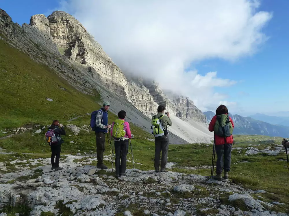 Heute starten wir noch einmal vom Grostè-Pass. Unser Weg führt zuerst auf das von Gletschern geformte Hochplateau. Die Landschaft ist beeindruckend und hochalpin. Auf einem alpinen Steig wandern wir weiter zur Tuckett-Hütte, einer wichtigen Ausgangsposition für Kletteraktivitäten in den Brenta-Dolomiten. Nach einer zünftigen Pause steigen wir ab bis zum Rifugio Vallesinella, von wo aus wir per Shuttle-Bus zurückfahren (GZ: 5 1/2 Std. , + 250 m, - 900 m, 2 Stiefel).
