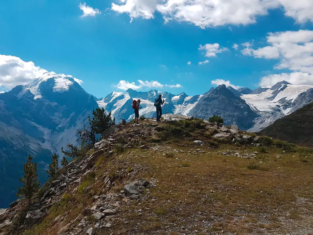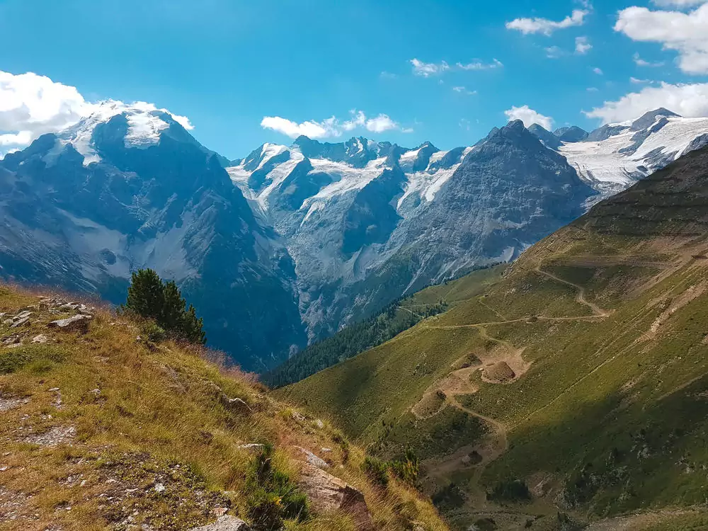 Auf dem Suldener Höhenweg begleitet uns ständig der Blick auf den Ortler (3.905 m). Unser Tagesziel ist die Hintergrathütte (2.661 m; GZ: 5 Std., +/- 800 m).