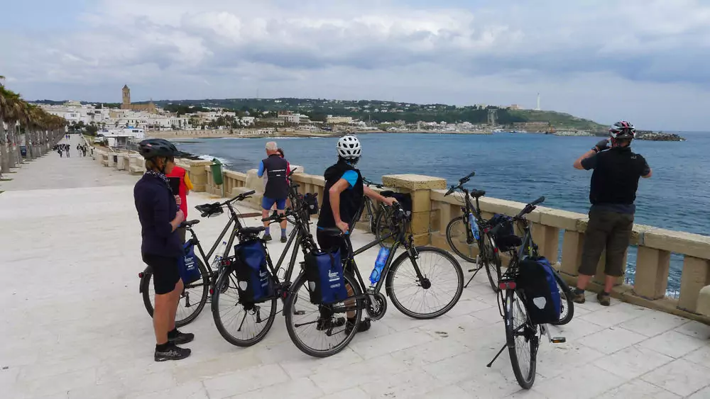 Am Morgen geht es auf den Rädern zuerst in die Altstadt von Ostuni, die wir zu Fuss erkunden. Danach radeln wir quer durch Apulien zum Ionischen Meer. Wir passieren Olivenplantagen und sehen alte Städtchen wie Oria und Manduria. Am Strand nehmen wir uns Zeit für ein erfrischendes Bad, bevor uns ein Bustransfer zu unser Hotel ca. 4 km außerhalb der Stadt Gallipoli bringt. Dort laden die schönen Strände erneut zu einem Sprung ins Meer ein. (2 Ü/F, A)