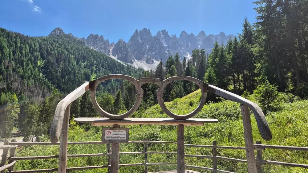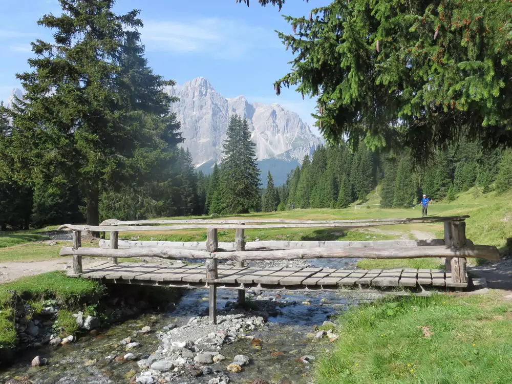 Auf zum Kreuzbergpass. Hier sind wir wieder umgeben von Zinnen und Zacken. Wir hüpfen von Alm zu Alm. Auf unserem Weg zur Nemesalm bekommen wir sie noch besser zu Gesicht. Mmmh, die Südtiroler Speck- und Käseplatte! Obendrauf bekommen wir den Dolomitenblick von der Sonnenterrasse. An der Klammbachalm gibt es ein ähnliches landschaftliches und kulinarisches Spektakel. Noch nicht genug an Südtiroler Schmankerln? Eine Hütte läge noch auf unserem Weg ... oder doch lieber direkt nach Moos absteigen (GZ: 5 Std., + 400 m, - 700 m)?
