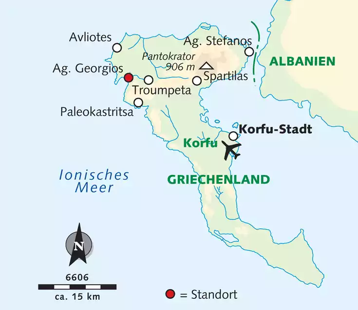 Hotel: Unser Drei-Sterne-Hotel Belle Helene mit 54 gut eingerichteten Zimmern ist mit einer Rezeption (Mietsafes), einem Lift und einer Bar ausgestattet. Die WLAN-Nutzung ist in der Lobby und an der Poolbar kostenfrei. Zwischen Hotel und Strand befindet sich der große Süßwasser-Pool mit einer Sonnenterrasse, Liegestühlen und Schirmen. Der Ausblick auf das Meer und die Bucht ist einmalig. Zimmer: Sat-TV, Kühlschrank, Telefon, Föhn, Klimaanlage (gegen Gebühr) und Balkon Verpflegung: Im Restaurant mit großer Fensterfront werden Frühstück und Abendessen eingenommen. Zweimal essen wir auswärts in Tavernen. Lage: In der von grünen Hügeln umgebenen Bucht von Agios Georgios/Pagon im Nordwesten der Insel. Ruhe und Erholung sind hier garantiert. Der Ort bietet uns auch ein bescheidenes, touristisches Ambiente mit einigen Bars, Tavernen und Geschäften. Nur eine kleine Straße trennt das Haus von dem etwa 3 km langen Sandstrand. Bis Korfu-Stadt sind es ca. 35 km.