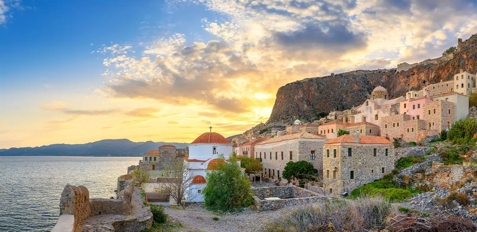 Durch den Namen gebenden „einzigen Eingang” gelangen wir zum auf den ersten Blick abweisend erscheinenden Felsen von Monemvasia. Wir haben viel Muße, das seit dem Mittelalter kaum veränderte Städtchen zu erkunden. Der Reiseleiter erzählt uns von der Verzweiflung des Kreuzritters Guillaume de Villehardouin beim Verlust seiner Stadt. Wer in einem Café mit Meerblick ohne Hast seinen Gedanken nachhängen möchte, kann das gerne tun. Der Nachmittag an einem der schönsten Fleckchen Griechenlands ist frei.