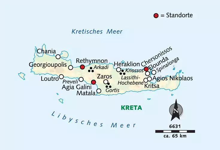 Am Termin 11.10. ändert sich der Reiseverlauf wie folgt: 4 Nächte in Rethymnon, 5 Nächte in Chersonissos und zum Schluss 5 Nächte in Agia Galini. Das Programm wird durchgeführt wie geplant, nur in anderer Reihenfolge ab Tag 5.