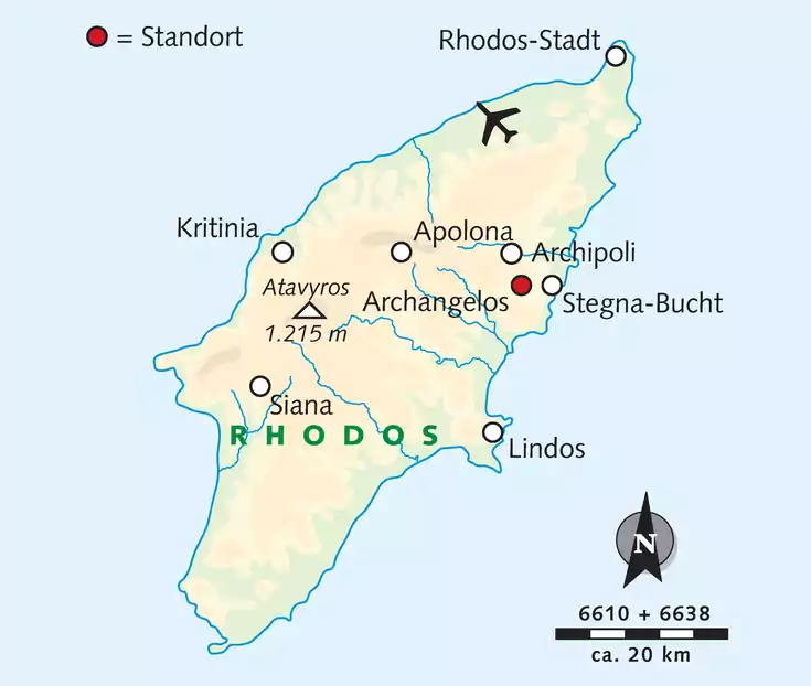 Hotel: Unser Familienhotel Saint George Resort (3*) hat 43 Zimmer, ein Restaurant, einen Außenpool und einen Olivengarten. Die besonders familiäre Atmosphäre zeichnet diesen Standort aus. Zimmer: Alle Zimmer verfügen über Balkon oder Terrasse und sind einfach eingerichtet mit Klimaanlage, Sat-TV, WLAN und Föhn. Verpflegung: Im Hotel bedienen wir uns am Frühstücksbüfett und bekommen abends ein Drei-Gänge-Menü. Serviert wird griechische Hausmannskost. Lage: Das Haus befindet sich ca. 15 Gehminuten vom Zentrum Archangelos` entfernt. Das "größte Dorf" (zweitgrößte Stadt) der Insel bietet mit verwinkelten Gassen, vielen Tavernen und Bars ein gemütliches Urlaubsambiente. An zwei freien Tagen ist ein Transfer kostenfrei zum langen Sandstrand von Tsambika (ca. 4 km entfernt) möglich, einem der schönsten Strände auf Rhodos.