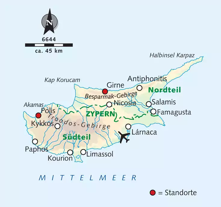Zypern ist einzigartig: hier türkisch, zwei Schritte weiter griechisch-zypriotisch. Auf der einen Seite gegensätzlich, auf der anderen Seite kulturell und historisch eng verwandt. Kontrastreich auch die Natur: Schroffe Berglandschaften und von der Zeit vergessene Dörfer wechseln sich ab mit duftenden Zitronenplantagen und schönen Buchten, die zum Verweilen und Entspannen einladen. Komm mit, entdecke das sonnige Zypern, die Heimat der Liebesgöttin Aphrodite.