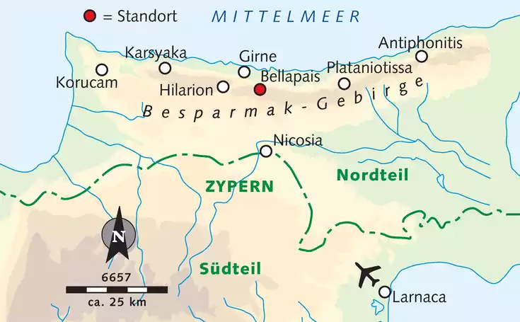 Hotel: Das Drei-Sterne Bella View Boutique Hotel bietet einen spektakulären Blick auf die Stadt Girne. Es verfügt über ein Restaurant, eine Pool-Bar, einen Swimmingpool und eine Minigolf-Anlage. Zimmer: Die 40 Zimmer sind mit Klimaanlage/Heizung, Minibar, Sat-TV, Telefon, WLAN und Föhn ausgestattet. Alle Zimmer sind liebevoll eingerichtet und unterschiedlich dekoriert. Verpflegung: Zum Frühstück bedienen wir uns am Büfett. Das Abendessen wird als 3-Gänge-Menü serviert. Lage: direkt unterhalb des Dorfes Bellapais. Girne ist etwa 5 km entfernt, Bellapais 1,5 km.