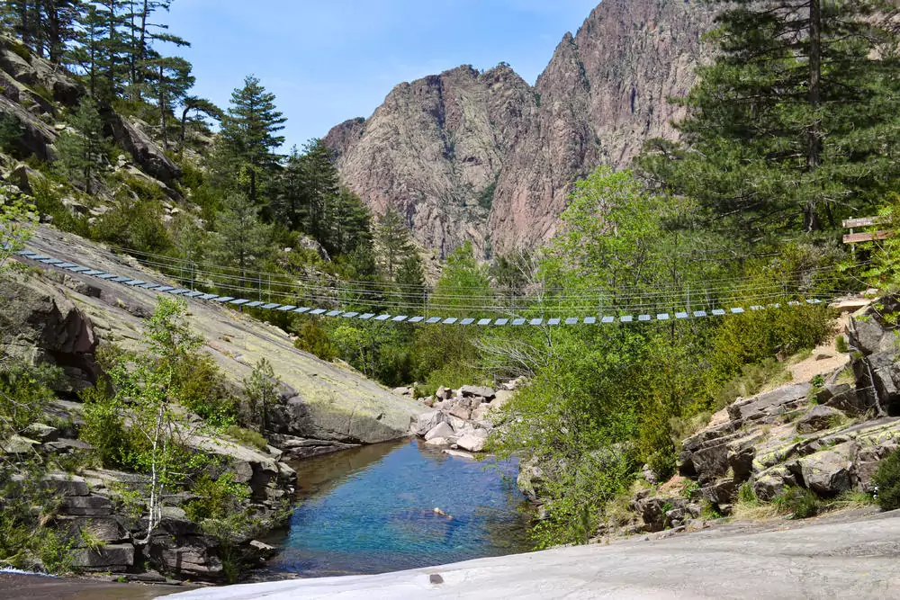 Nochmals im Waldgebiet von Bonifato führt uns diese Wanderung durch Wald am kühlen Spasimatabach aufwärts. Nach 1 1/2 Std. erreichen wir die erste Hängebrücke. Weiter auf steinigem Pfad geht es steil aufwärts. Plötzlich lichtet sich der Weg und gibt herrliche Blicke in den "Kessel von Bonifato", die höchsten Berge Korsikas, frei. Hier beginnt der berühmte GR 20 auf dem wir ein kleines Stück abwärts steigen. Unterhalb der zweiten Hängebrücke gibt es dann die verdiente Bade- und Mittagspause. Auf gleichem Wege geht es zurück bis zum Forsthaus von Bonifato mit Schlusseinkehr im Garten (GZ: 5 Std., +/-700 m).