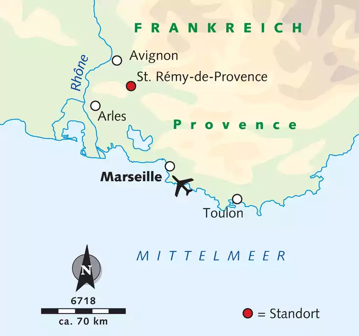 Die Provence mit ihrem Blumenreichtum, dem unvergleichlichen Licht, der bezaubernden Landschaft, den malerischen Dörfern und den weltberühmten Städten hat viele Künstler zu unvergänglichen Werken inspiriert. In St. Rémy-de-Provence entstanden van Goghs beste Bilder. Das Städtchen ist der ideale Ausgangsort zum Besuch von Avignon, Arles und Nîmes, der weltberühmten Pont du Gard, der malerischen Orte Les Baux, Gordes und Roussillon, ein Naturwunder aus farbenprächtigen Ockerfelsen, und der einzigartigen Sumpflandschaft der Camargue. Und mit den Alpilles, der Vaucluse und dem Petit Lubéron finden wir dort auch 3 der schönsten Wandergebiete.