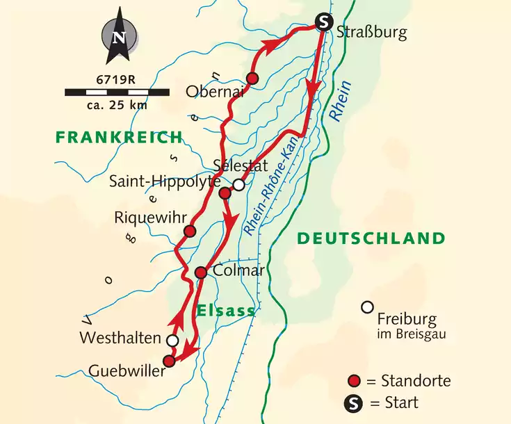 Hochwertige Weine, idyllische Dörfer mit blumenverzierten Fachwerkhäusern und kulinarische Gaumenfreuden – herzlich Willkommen im Elsass! Während unserer Radreise zwischen Rhein und Vogesen lockt Straßburg mit seiner charmanten Altstadt, Eguisheim glänzt mit einem reichen Kulturerbe und Colmar verzückt mit seinen gemütlichen Gässchen und malerischen Brücken. Die Elsässische Küche vereint französische Raffinesse und deutsche Deftigkeit. Probiere den berühmten Flammkuchen und genieße dazu einen perlenden Wein.