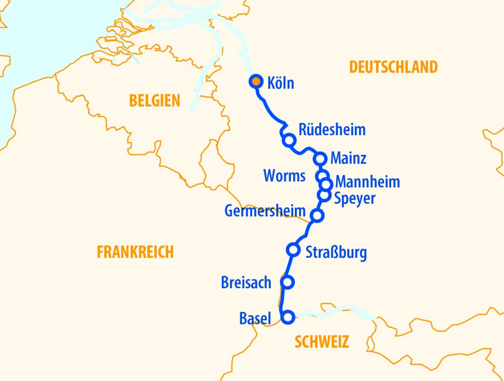 Am Nachmittag heißt es Leinen los und wir erholen uns an Bord bei der Fahrt durch die Oberrheinische Tiefebene. Mannheim und Mainz sind am gleichen Tag die nächsten Stationen unserer Reise. Beide Städte lernen wir auf Stadtrundgängen kennen, bevor wir unseren Abschiedscocktail und eine Galadinner an Bord genießen. Am nächsten Morgen hat unser Schiff schon in Köln festgemacht und wir verabschieden uns von MS VistaRio.