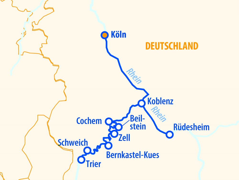 Trier markiert den Wendepunkt unserer Reise, und MS VistaRio nimmt nun Kurs stromabwärts nach Cochem. Hoch über der Stadt thront die markante Reichsburg, die nach ihrer Zerstörung im Stil der Burgenromantik des 19. Jahrhunderts wieder aufgebaut wurde. Am folgenden Tag erkunden wir ausgiebig Koblenz, die Stadt an Rhein und Mosel. Wir spazieren zum Deutschen Eck und haben die Möglichkeit, mit der Seilbahn über den Rhein zur Festung Ehrenbreitstein zu schweben. Erst am späten Abend verabschieden wir uns von der Mosel und treten die Rückreise nach Köln an, wo wir am nächsten Morgen unser schwimmendes Hotel mit vielen schönen Erinnerungen verlassen.