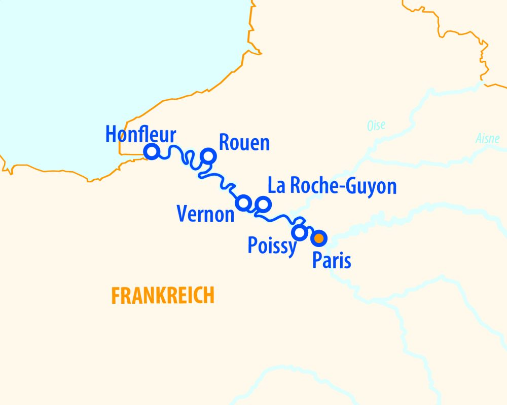 Auf dem Weg von Paris nach Honfleur entdecken wir mit MS Renoir die reizvollsten Orte entlang der Seine – von Königsschlössern bis zur Küste der Normandie. Auf dem Weg erwarten uns barocke Gartenkunst in Versailles, gotische Meisterwerke in Rouen, die maritime Romantik von Honfleur und das Licht des Impressionismus in Giverny. Während die Landschaft gemächlich vorbeizieht, genießen wir französische Lebensart, kulinarische Genüsse und das stilvolle Ambiente an Bord.