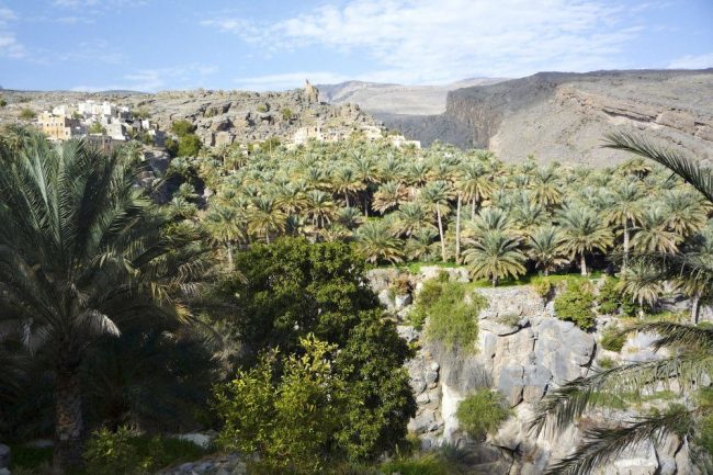 Durch den Wadi Beni Awf gelangen wir zum Wadi Sahtan: Die Straße windet sich durch eine enge Schlucht, in der entlang der Felswände Palmengärten aus Dattelpalmen, Mangobäumen und Bananenstauden angelegt sind. Am Ende öffnet sich die Schlucht zu einem großen Kessel. Wir ziehen die Wanderschuhe an und folgen auf alten Eselspfaden den Verbindungen der einzelnen Siedlungen. Vor uns die imposante 2.000 Meter steil aufragende Nordwand des Jebel Shams.