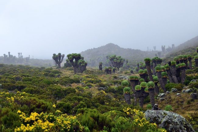 Die Vegetation wird allmählich buschiger und niedriger, je mehr wir an Höhe gewinnen. Nach kurzer Zeit erreichen wir den Übergang vom Regenwald zu den sogenannten "Moorlands", das Hochmoor. Wir kommen vorbei an den berühmten Kilimanjaro-Senecien und erspähen zum ersten Mal den mächtigen Gipfelaufbau des Kibo, wenn es das Wetter zulässt. Die heutige Etappe ist etwas länger, als die Gestrige. Zur Mittagsrast lädt ein kleiner Picknickplatz am Wegrand ein, er wird "Kimangi Marangu" genannt und war früher ein bedeutender Platz für die "Regenmacher". Weiter bergauf erreichen wir voraussichtlich am frühen Nachmittag die Horombo-Hütte (3.720 m). Nach einer kurzen Pause sollten wir noch eine Akklimatisierungswanderung unternehmen, die unserer Höhenanpassung zuträglich ist und uns besser schlafen lässt.