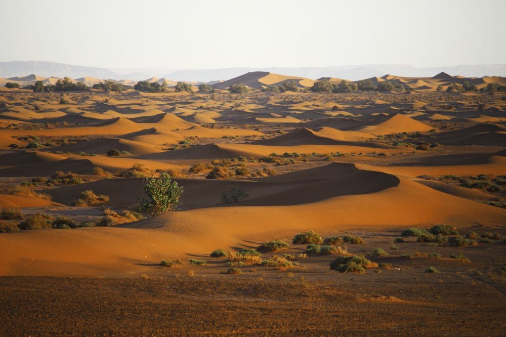 Heute kommt richtiges Wüsten-Feeling auf, denn wir sind umgeben von Sanddünen. Gegen Mittag erreichen wir das trockene Tal des Draa-Flusses und legen bei Tamarisken-Bäumen im Schatten unsere Mittagspause ein. Nachmittags wandern wir erst vorbei an einem verlassenen Oasen-Dörfchen, dessen Ruinen davon zeugen, dass die Wüste sich hier stärker ausgebreitet hat. Wir tauchen ein in einsame Regionen, die von keinem Auto mehr befahren werden können und wandern bzw. reiten direkt auf ein großes Dünenmassiv zu. An unserem Lager angekommen, haben wir die Möglichkeit, auf die höchsten Dünenkämme aufzusteigen. Von oben wird klar, dass wir uns inmitten eines unendlich scheinenden Dünenmeeres befinden, welches am Horizont von einer großen Bergkette eingerahmt wird. Nach dem Sonnenuntergang wird das Abendessen in unserem Camp im Messezelt oder unter freiem Himmel serviert.
