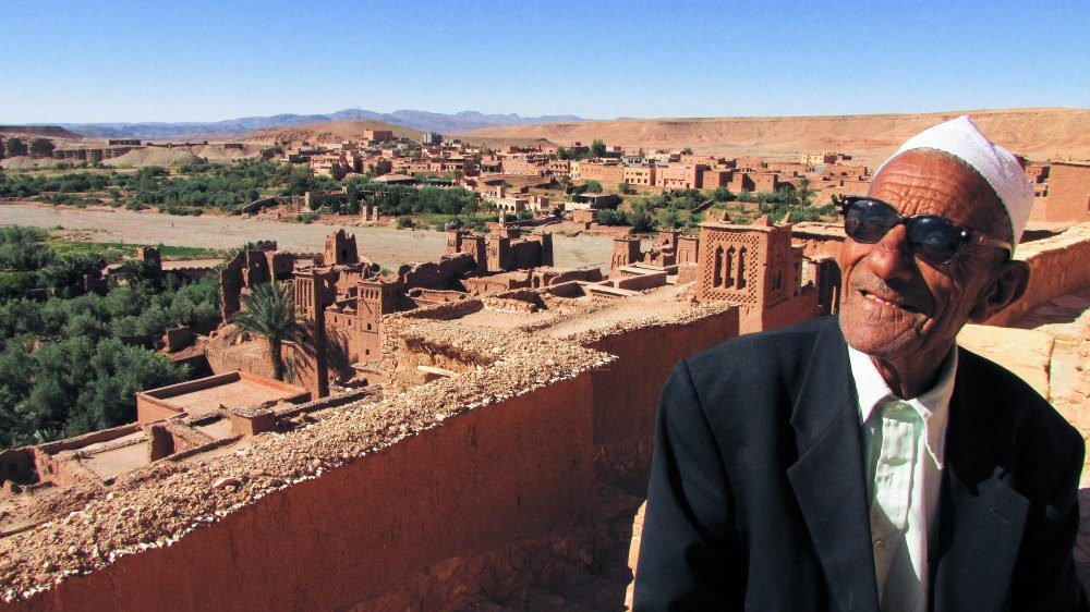 Am Morgen verabschieden wir uns von unseren Begleitern und den Kamelen. Früh treffen die Geländewagen ein und wir durchqueren die trockene Senke des Iriki-Sees. In Foum Zguid erreichen wir nach Tagen in der Wüste wieder eine bewohnte Siedlung und führen unsere Fahrt auf der Asphaltstraße über ein Oasen-Tal und mehrere kleine Bergpässe fort. Unterbrochen von einem Mittagessen in einem einfachen Lokal unterwegs, erreichen und besichtigen wir das Wehrdorf Ait Benhaddou. Die großen Lehmbau-Kasbahs sind unten von Palmen umgeben und ziehen sich durch enge Gassen den Berg hinauf bis zu einem Aussichtspunkt. Anschließend fahren wir nach Ouarzazate, wo wir die Nacht verbringen.