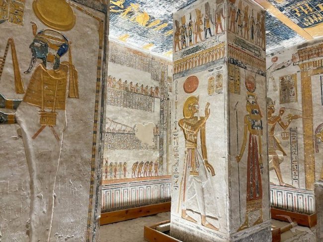 Nach dem Frühstück bleiben Sie auf der Seite von Theben West. Im berühmten Tal der Könige, das mit der Entdeckung des Tutanchamun-Grabes durch Howard Carter im Jahre 1922 Weltruhm erlangte, besuchen Sie einige der reich verzierten Pharaonengräber von innen. Anschließend besichtigen Sie den Totentempel der Hatschepsut und sehen die gewaltigen Memnon-Kolosse. Im Anschluss fahren Sie mit einem Boot über den Nil und besuchen in Luxor den Karnak-Tempel, der durch seine gewaltigen Kolonnaden besonders imposant erscheint. Ihr Reiseführer zeigt Ihnen u.a. den ersten nachweislich festgehaltenen Friedensvertrag der Weltgeschichte, der in seinen Mauern verewigt ist (das Mittagessen wird unterwegs in einem Restaurant eingenommen).
