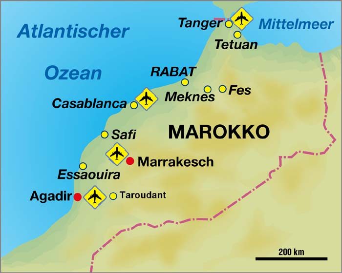 Hinflug vom gewählten Abflughafen nach Agadir oder Marrakesch. Empfang durch die Reiseleitung und Transfer zu Ihrem Hotel in Marrakesch.
