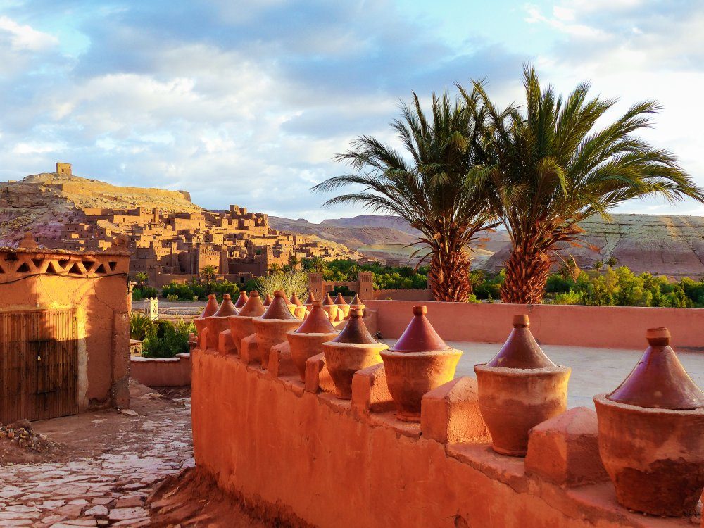 Am Morgen verabschieden wir uns von unseren Begleitern und den Kamelen. Früh treffen die Geländewagen ein und wir durchqueren die trockene Senke des Iriki-Sees. In Foum Zguid erreichen wir nach Tagen in der Wüste wieder eine bewohnte Siedlung und führen unsere Fahrt auf der Asphaltstraße über ein Oasen-Tal und mehrere kleine Bergpässe fort. Unterbrochen von einem Mittagessen in einem einfachen Lokal unterwegs, erreichen und besichtigen wir das Wehrdorf Ait Benhaddou. Die großen Lehmbau-Kasbahs sind unten von Palmen umgeben und ziehen sich durch enge Gassen den Berg hinauf bis zu einem Aussichtspunkt. Anschließend fahren wir nach Ouarzazate, wo wir die Nacht verbringen.