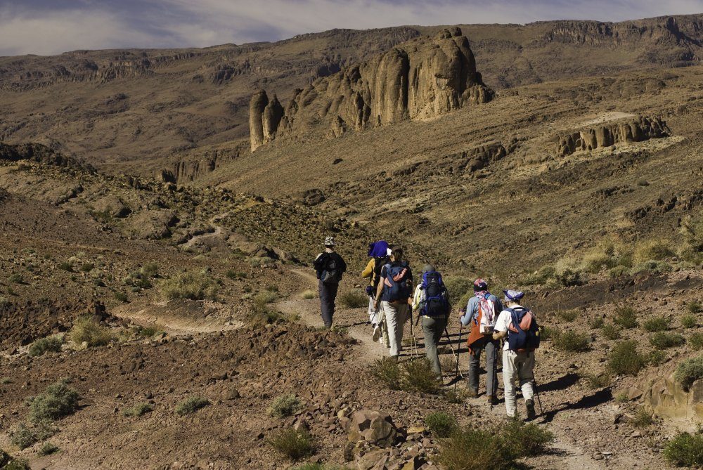 Über ein Plateau wandernd ist unser erstes Ziel der Aussichtsberg Kouaouch (2.592 m). Der Gipfel bietet eine Rundumsicht ins Saghro-Gebirge und auf den Hohen Atlas. Wir wandern zwischen gewaltigen Tafelbergen mit bizarren Erosionsformen hindurch. Schließlich treffen wir in der Oase Igli (1.700 m) ein und schlagen, von einer Felskulisse umgeben, die Zelte auf. Diese Region ist zeotweise von Nomadenfamilien besiedelt, die in dem kargen Weideland von der Schaf- und Ziegenzucht leben.
