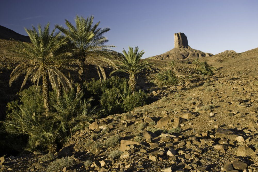 Morgens steigen wir über teils lose Steine nach Ousdidene Bab n'Ali (1.500 m) hinauf; von dort bietet sich ein herrlicher Blick auf die unterhalb gelegene Oase, die sich üppig grün von der wüstenhaften Landschaft abhebt. Nach dem Abstieg wandern wir durch weite Landschaften, noch lange Zeit ist einer der mächtigen Türme des Bab n'Ali zu sehen. In dieser Gegend leben vor allem die Berber vom Volk der Ait Atta. Wir wandern weiter in ständigem, leichten auf und ab. Am Nachmittag wandern wir nach Tifrite, wo wir abgeholt werden und nach Nkob fahren. Unsere heutige Unterkunft bietet willkommenen Komfort zwischen unseren Zelt-Trekkings.