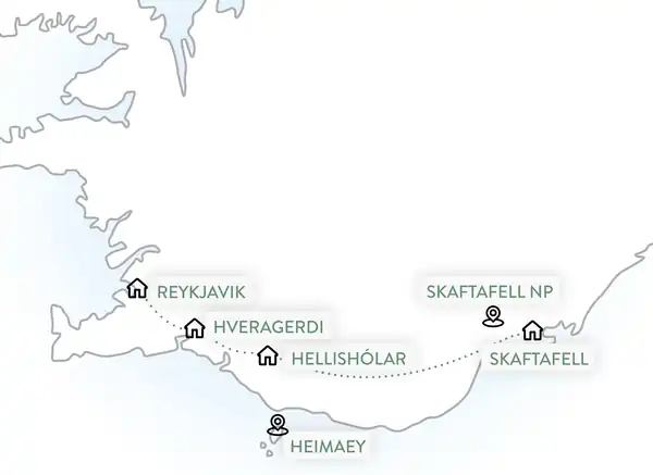 Fähre ahoi! Heute setzen wir über auf die Westmännerinseln – ein Archipel aus 15 wild verstreuten Inseln vor Islands Südküste. Unser Ziel: Heimaey, die größte und einzige bewohnte Insel. Eine Welt für sich. Eine Mischung aus rauer Natur und lebendiger Geschichte. Schroffe Klippen, grüne Wiesen, schwarze Lavafelder – und rundherum: der Atlantik, ungezähmt und weit. Kaum angekommen, steigen wir auf den Vulkan Eldfell. Der Pfad führt über erstarrte Lava. Oben wartet ein Rundumblick, der dir den Atem raubt: Ozean, Krater, Küste, Freiheit pur (GZ: 3 1/2 Std., +/- 440m). Zurück auf dem Festland fahren wir weiter nach Hellishólar. Für die nächsten drei Nächte heißt es: feste Betten. Willkommen bei unserem Gastgeber Vidir.