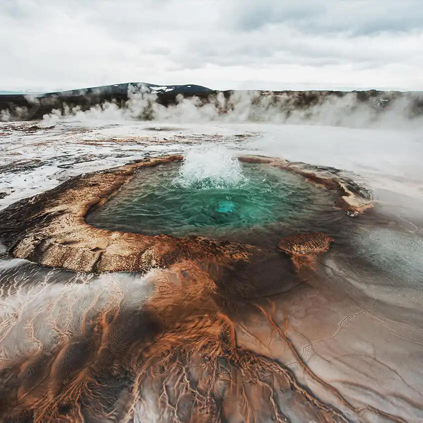 Wir starten mit einem echten Island-Klassiker – aber auf unsere Art. Vom Camp in Reykjavik geht’s direkt ins Herz geologischer Superlative. Erste Station: Thingvellir. Dort, wo Kontinente auseinanderdriften wandern wir ca. eine Stunde durch die geschichtsträchtige Umgebung. Weiter geht’s zum Geysir. Und ja, Strokkur lässt nicht lange auf sich warten: Alle paar Minuten schießt er meterhoch in die Luft – dampfend, zischend, spektakulär. Und dann Gullfoss, der goldene Wasserfall. Wild, tosend, mächtig. Regenbögen inklusive. Am Abend rollen wir weiter nach Hveragerði. Unser Zeltplatz liegt zwischen dampfenden Hügeln. Du bist angekommen im Land aus Feuer und Eis.