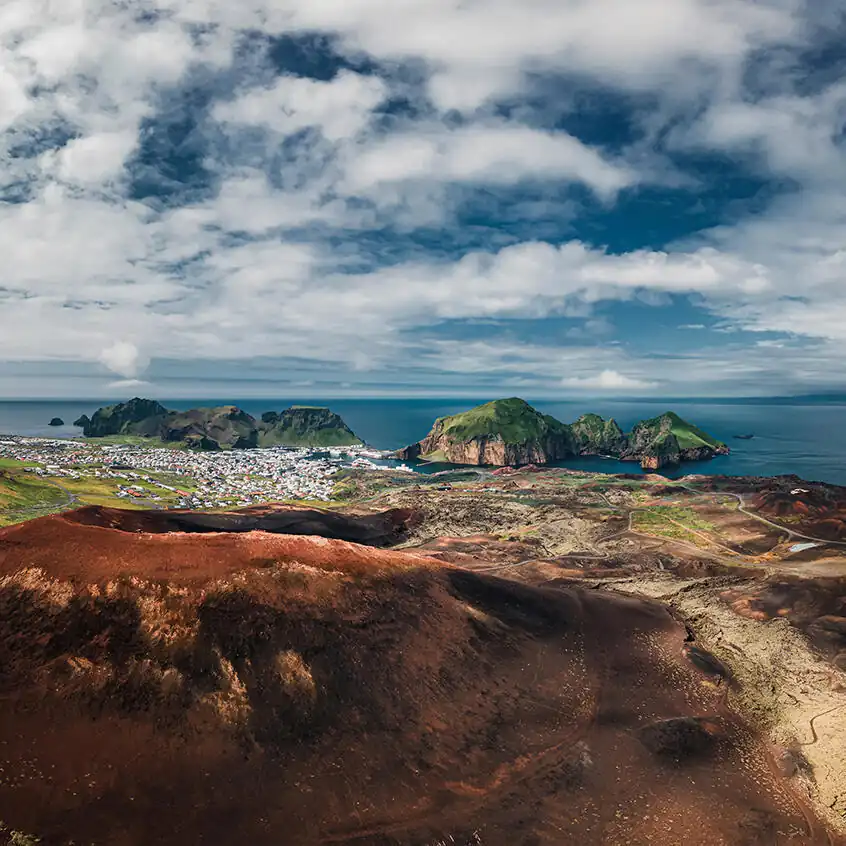 Feuerinseln im Atlantik - Vor der Südküste Islands ragen die Westmännerinseln wie rohe, vom Ozean geformte Skulpturen aus dem Wasser. Auf Heimaey wandern wir über frische Lavafelder, die noch immer von dem Ausbruch von 1973 erzählen. Basaltklippen fallen steil ins Meer, wo unzählige Seevögel kreisen und die Brandung wie ein permanenter Herzschlag klingt. Zwischen Vulkanhängen und Fischerdorf zeigt sich Island hier in seiner ursprünglichsten, windumtosten Form.