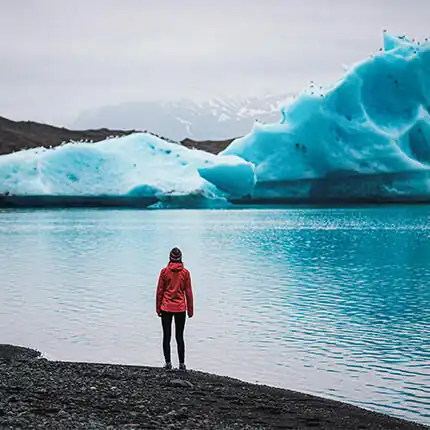 Erster Stopp: Jökulsárlón, die Gletscherlagune. Hier treiben riesige Eisberge lautlos durchs Wasser, als würden sie tanzen – manchmal blau, manchmal weiß, immer magisch. Wenn du Glück hast, siehst du Robben zwischen den Schollen. Weiter geht’s Richtung Küste – zum Stokksnes-Kap. Schwarzer Sand trifft auf das dramatisch aufragende Vestrahorn, einer der ikonischsten Berge Islands. Wir wandern entlang der Dünen, hören das Meer rauschen (GZ: 2 – 3 Std., +/- 55 m). Abends kehren wir zurück in unser Camp in Skaftafell.