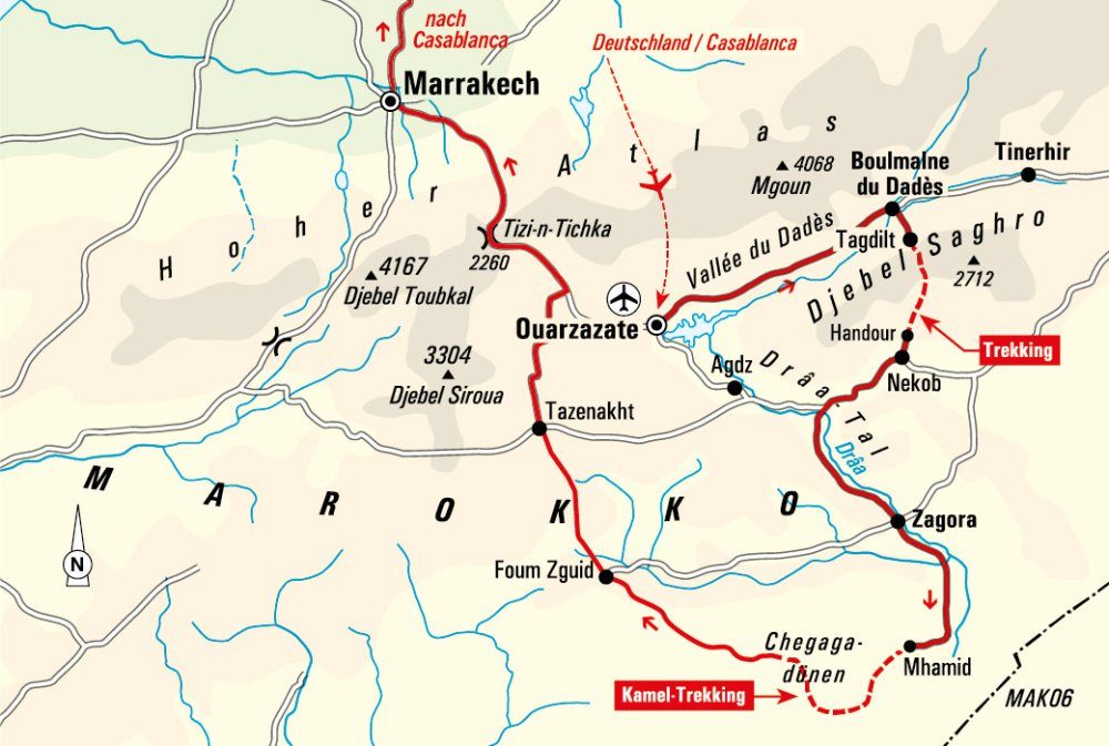 - Flug mit Royal Air Maroc ab/bis Frankfurt via Casablanca nach Ouarzazate, zurück ab Casablanca (nach Verfügbarkeit; Aufpreis ist möglich)\n