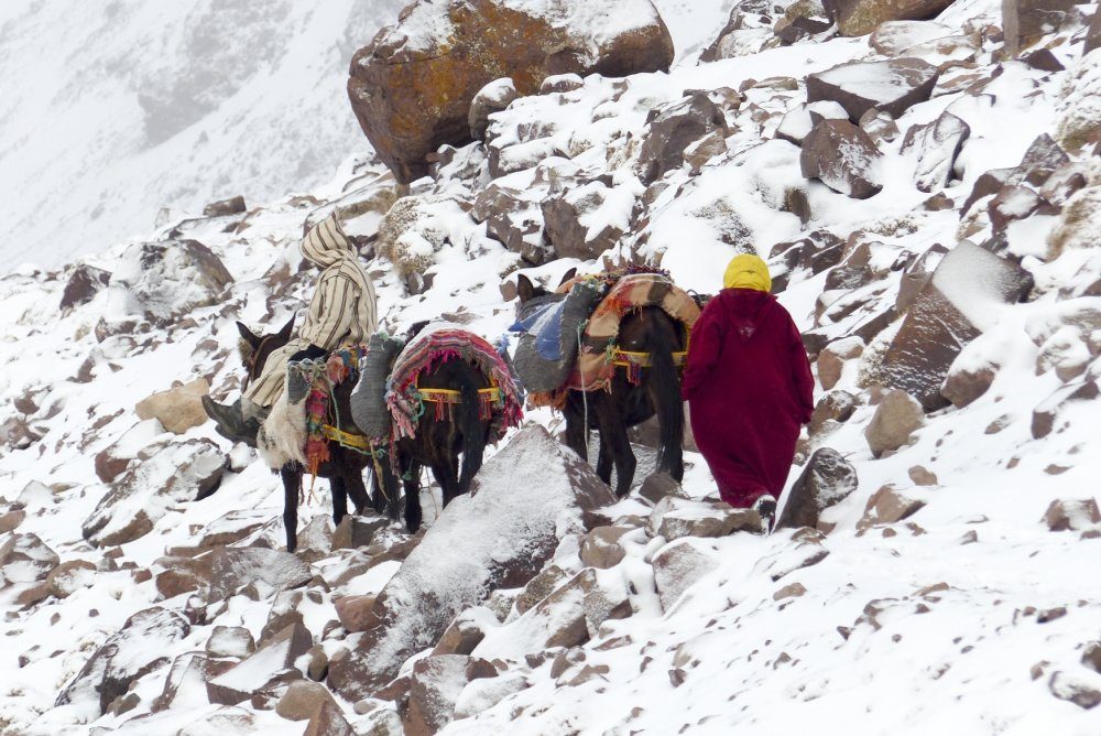 Nach dem Frühstück teilen die Mulitreiber unser Gepäck auf und wir beginnen unser Trekking. Durch das Ait Mizane-Tal geht es zum Schrein von Sidi Chamarouch (2.350 m). Zu Ehren eines Heiligen, dem vom Volk magische Kräfte zugeschrieben werden, ist hier eine kleine Wallfahrtsstätte. Abhängig von den Schneeverhältnissen wird unser Gepäck von den Maultieren auf Träger verteilt. Der Pfad führt uns in Serpentinen weiter den Berg hinauf, es wird steiler und anstrengender. Schließlich erreichen wir das Toubkal Basecamp und die Neltner-Hütte (3.200 m). Am Nachmittag demonstriert uns unser Guide, wie man sicher mit Steigeisen und Eispickel umgeht. Nach ein paar theoretischen und praktischen Übungen fühlen wir uns fit für die kommenden Etappen.